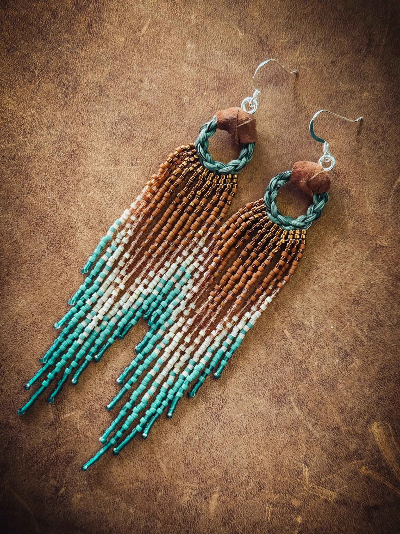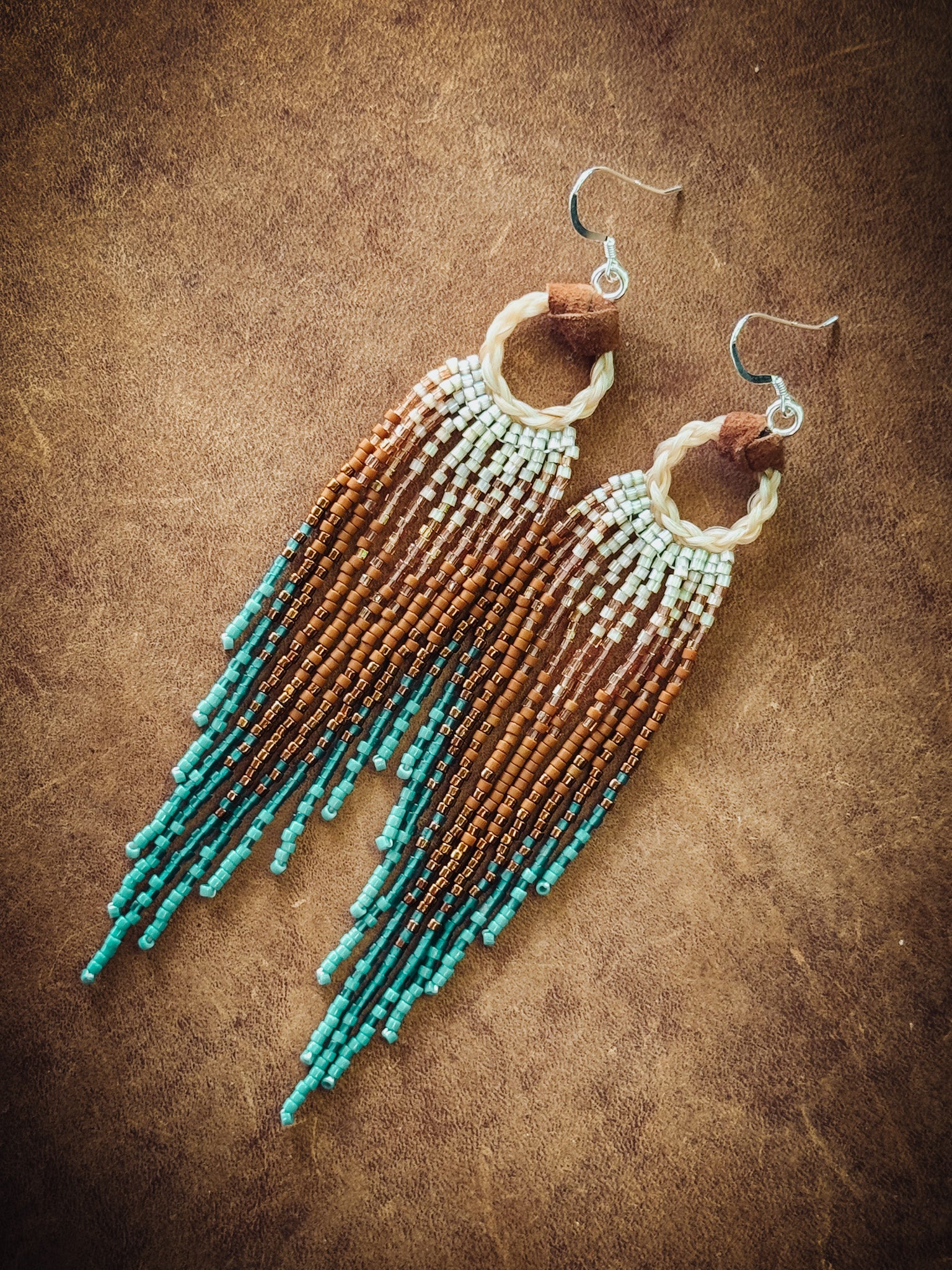 Beaded Horse Hair Earrings. The horse hair are of my born blind heart horse, Lea! These beauties really sparkle!! Delica glass seed beads, horse hair, leather, and Sterling Silver hooks.