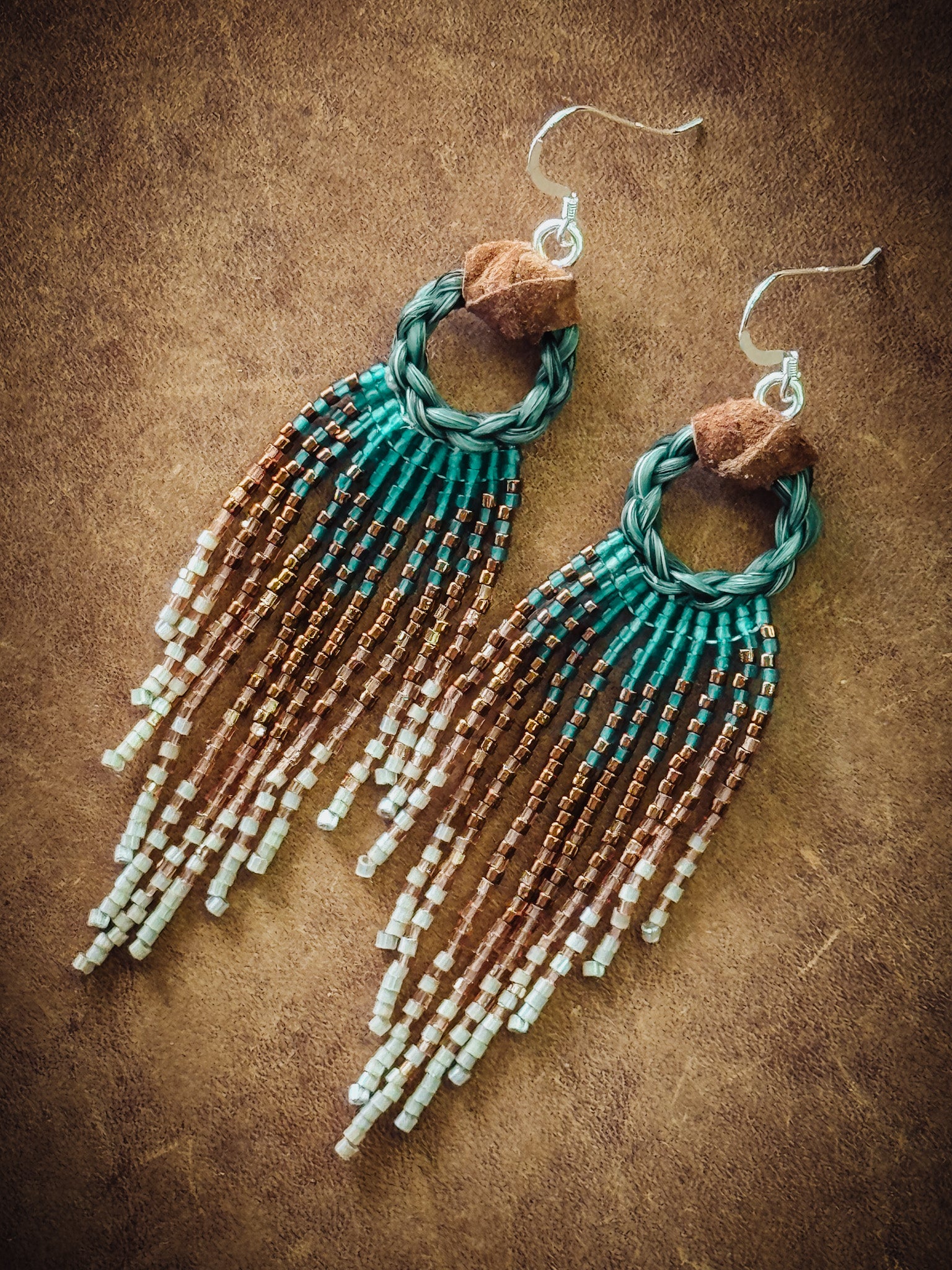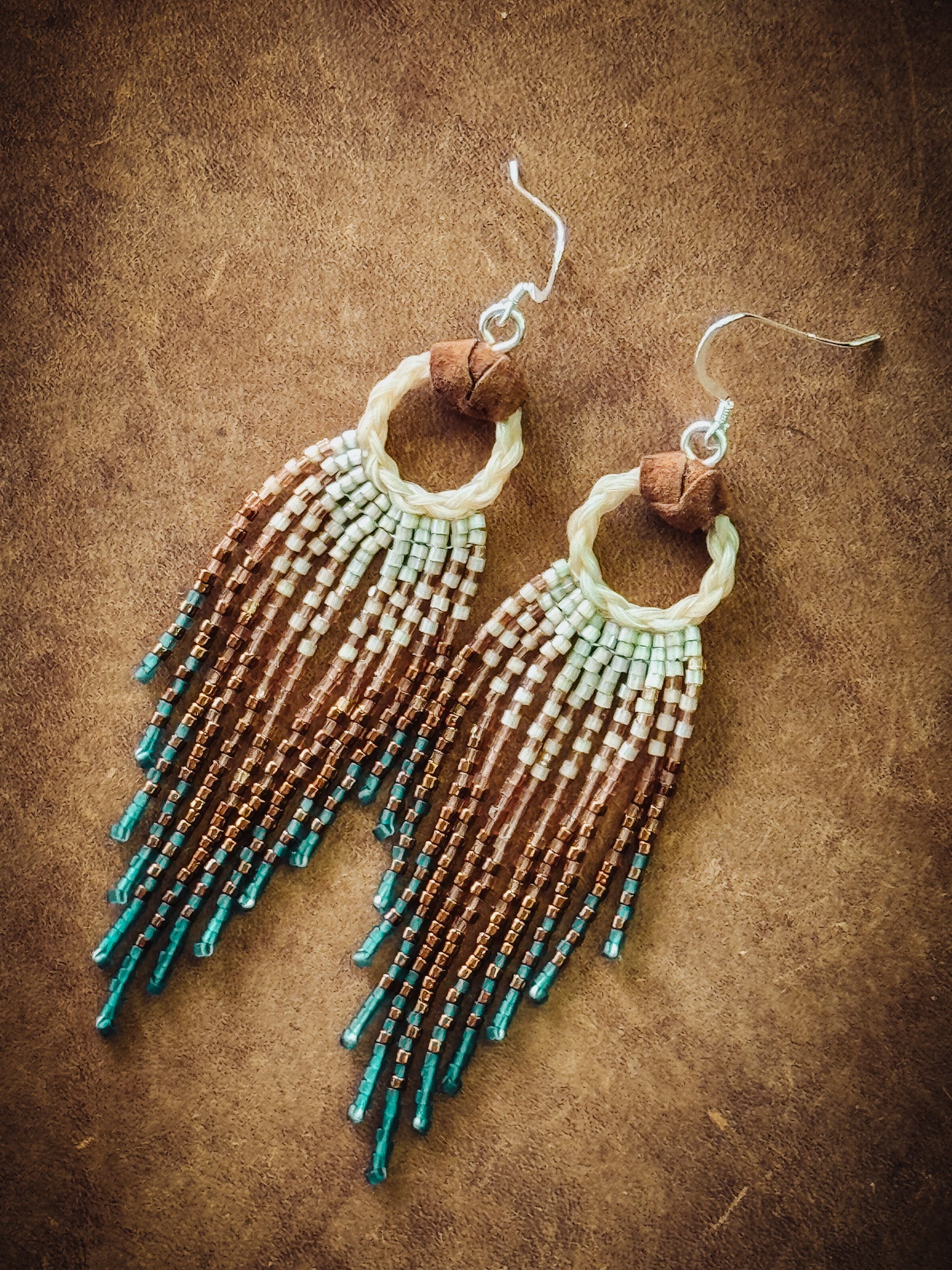 Beaded Horse Hair Earrings. The horse hair are of my born blind heart horse, Lea! These beauties really sparkle!! Delica glass seed beads, horse hair, leather, and Sterling Silver hooks.